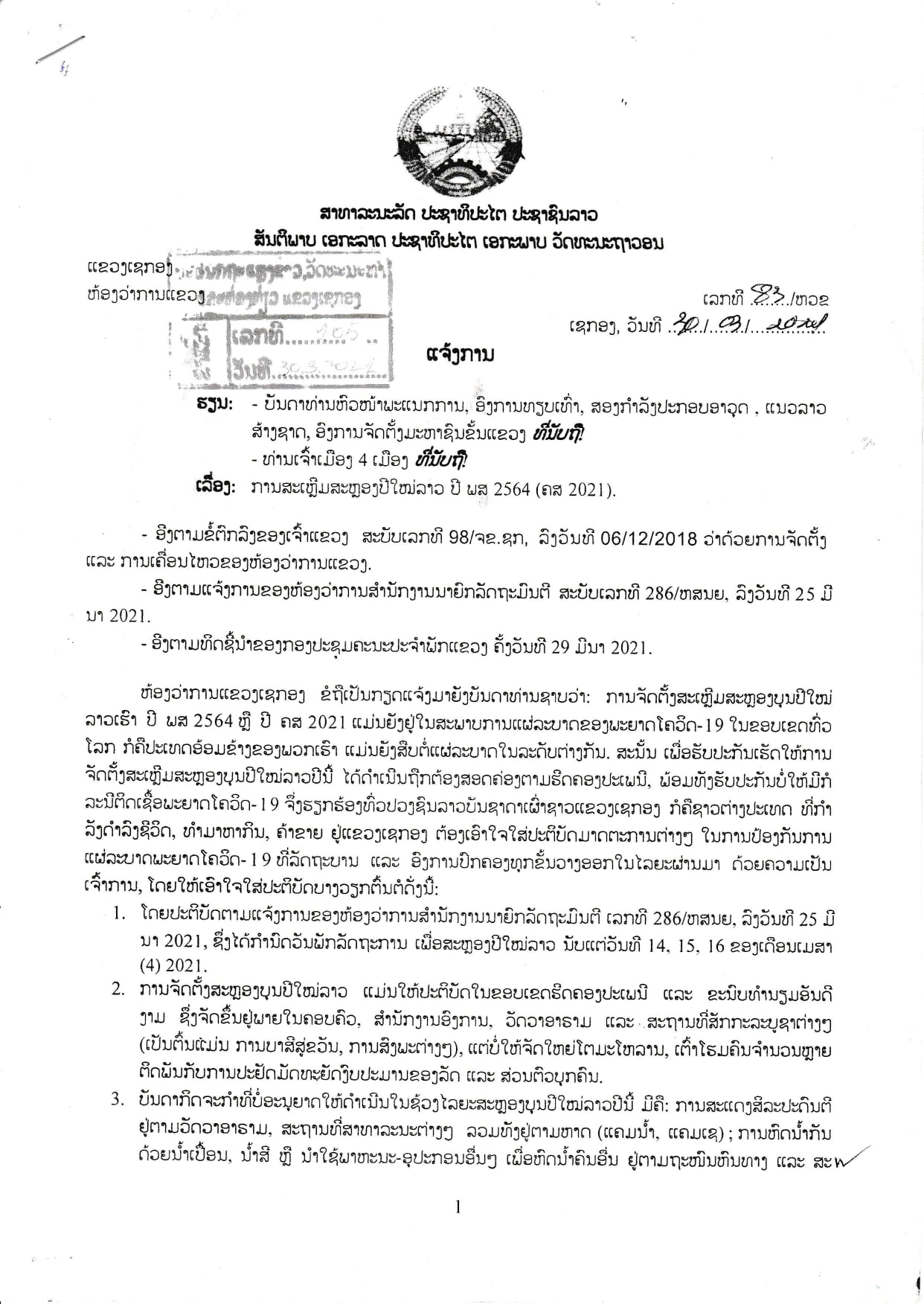 ຫ້ອງວ່າການແຂວງເຊກອງ ໄດ້ອອກແຈ້ງການສະບັບເລກທີ 83/ຫວຂ, ລົງວັນທີ 30 ມີນາ 2021 ກ່ຽວກັບການສະເຫຼີມສະຫຼອງບຸນປີໃໝ່ລາວ ພສ 2564 ກ່ຽວກັບການສະເຫຼີມສະຫຼອງບຸນປີໃໝ່ລາວປະຈໍາປີ ພສ 2564 ເນື່ອງຈາກສະພາບການແຜ່ລະບາດຂອງພະຍາດໂຄວິດ-19 ໃນທົ່ວໂລກຍັງສືບຕໍ່ລະບາດໃນລະດັບຕ່າງໆ, ສະນັ້ນ ເພື່ອຮັບ ປະກັນໃຫ້ການສະເຫຼີມສະຫຼອງບຸນປີໃໝ່ລາວປີນີ້ ໄດ້ດໍາເນີນສອດຄ່ອງຕາມປະເພນີ ແລະເພື່ອພ້ອມກັນສືບຕໍ່ປະຕິບັດມາດຕະການຕ່າງໆໃນການປ້ອງກັນການແຜ່ລະບາດຂອງພະຍາດໂຄວິດ-19 ດ້ວຍຄວາມເປັນເຈົ້າການ ໂດຍເອົາໃຈໃສ່ບາງວຽກຈຸດສຸມຕົ້ນຕໍດັ່ງນີ້: