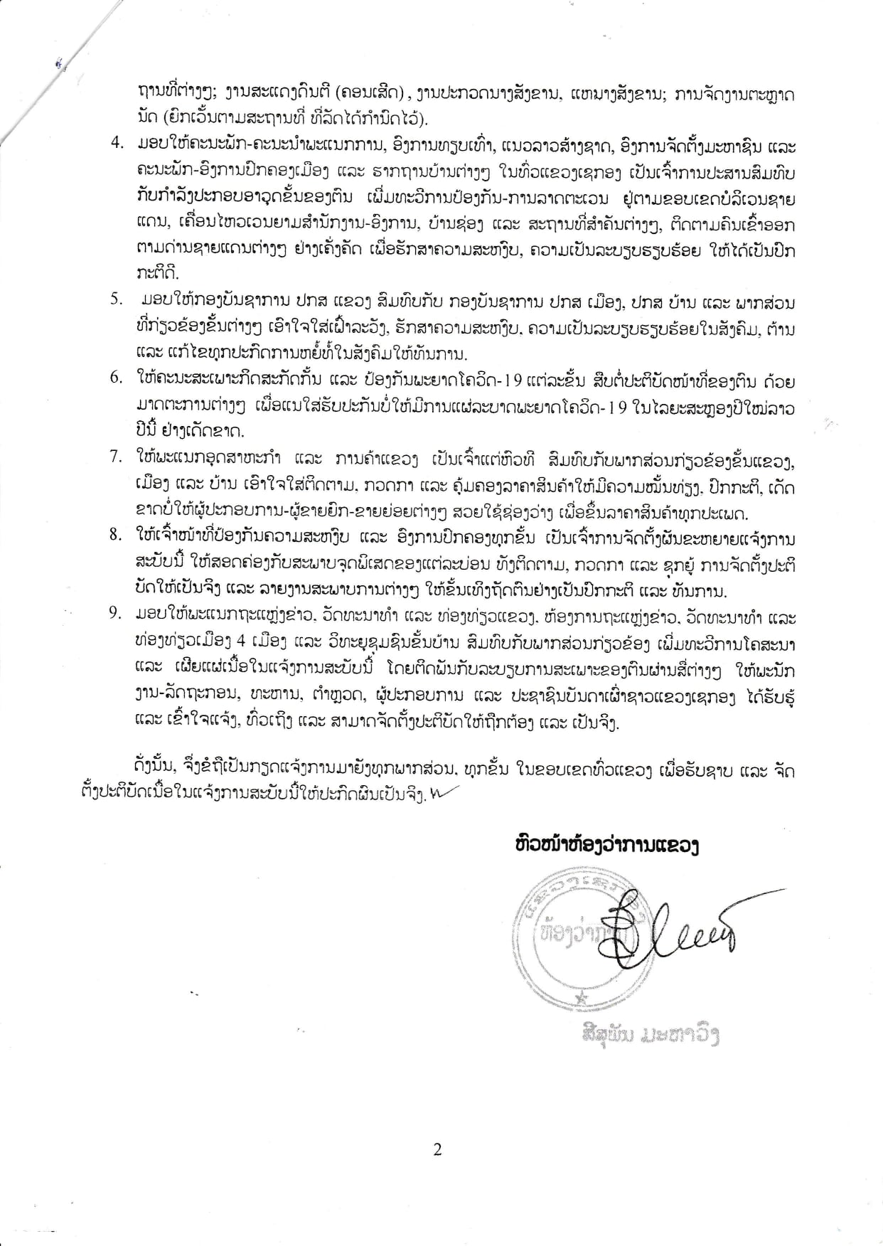 5: ມອບໃຫ້ກອງບັນຊາການ ປກສ ແຂວງສົມທົບກັບພາກສ່ວນກ່ຽວຂ້ອງ ເອົາໃຈໃສ່ເຝົ້າລະວັງຮັກສາຄວາມສະຫງົບ, ຄວາມເປັນລະບຽບຮຽບຮ້ອຍໃນສັງຄົມ, ຕ້ານ ແລະແກ້ໄຂທຸກປະກົດການຫຍໍ້ທໍ້ໃນສັງຄົມໃຫ້ທັນການ; 6: ໃຫ້ຄະນະສະເພາະກິດສະກັດກັ້ນ ແລະປ້ອງກັນໂຄວິດ-19 ແຕ່ລະຂັ້ນ ສືບຕໍ່ປະຕິບັດໜ້າທີ່ຕົນດ້ວຍມາດຕະການຕ່າງໆ ເພື່ອແນໃສ່ຮັບປະກັນບໍ່ໃຫ້ມີການແຜ່ລະບາດພະຍາດໂຄວິດ-19 ໃນໄລຍະສະຫຼອງປີໃໝ່ນີ້ຢ່າງເດັດຂາດ; 7: ໃຫ້ພະແນກອຸດສາຫະກໍາ ແລະການຄ້າແຂວງສົມທົບກັບພາກສ່ວນກ່ຽວຂ້ອງຄຸ້ມຄອງລາຄາສິນຄ້າໃຫ້ມີຄວາມໝັ້ນທ່ຽງ ແລະປົກກະຕິ, ເດັດຂາດບໍ່ໃຫ້ຜູ້ປະກອບການສວຍໃຊ້ຊ່ອງວ່າງ ເພື່ອຂຶ້ນລາຄາສິນຄ້າທຸກປະເພດ;